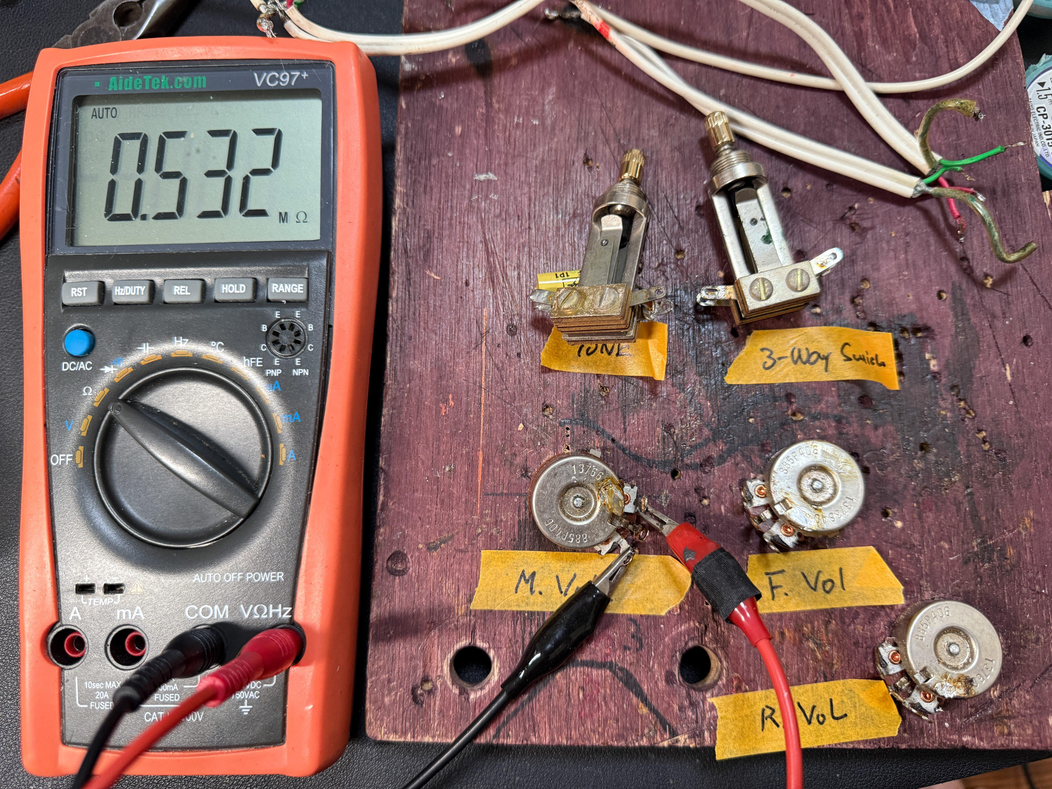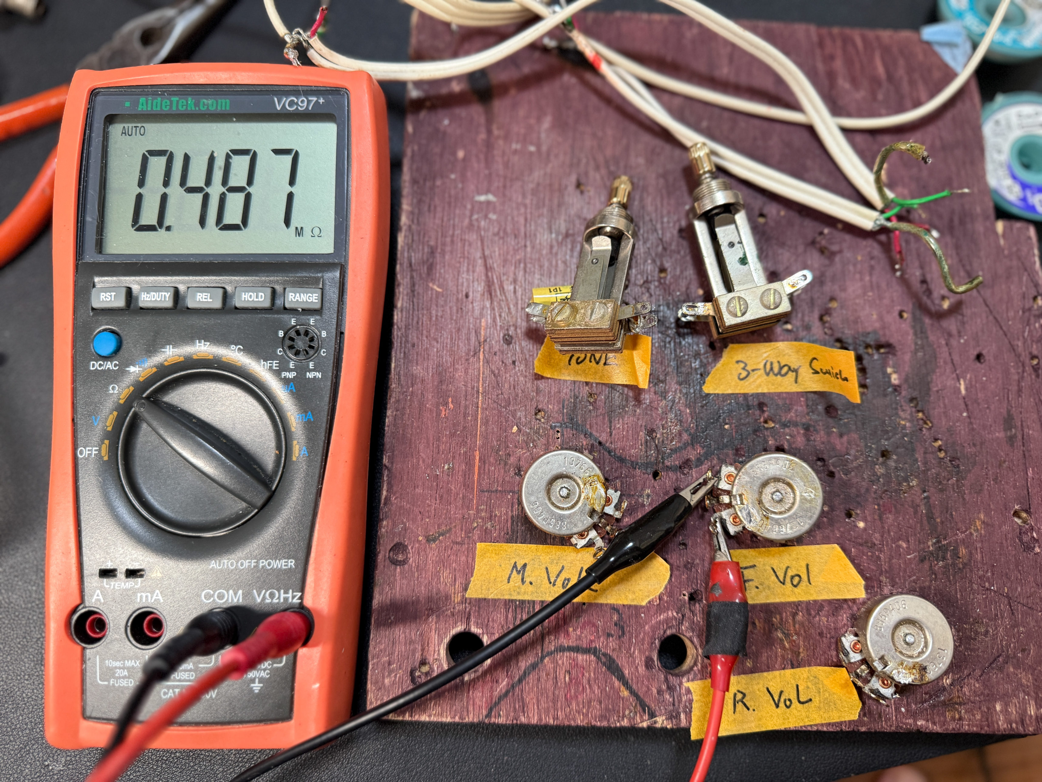 ワイヤーを全て外すとPotentionmeterの値は500K前後を示す。マスターボリューム532K、F Vol 487K、R Vol 490Kという抵抗値。ヴィンテージ配線では並列接続されていたので250K前後の値だった。ガリが全く無いのがすごい。